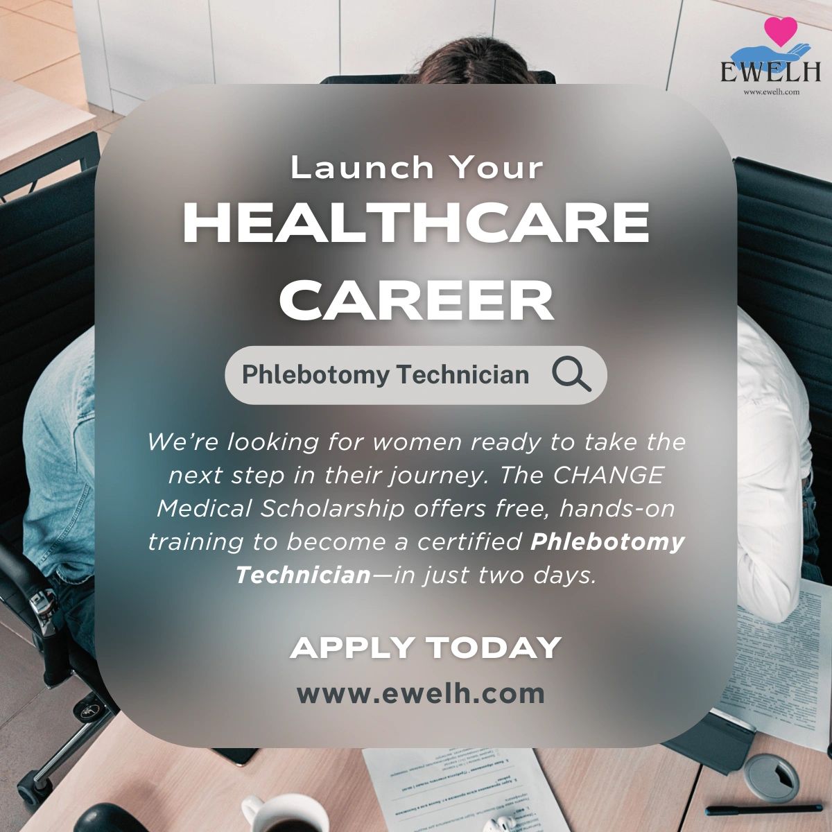 Twice a year, EWELH offers the CHANGE Medical Scholarship, which awards five selected women the opportunity to attend a two-day training to receive their certification as a licensed Phlebotomy Technician.